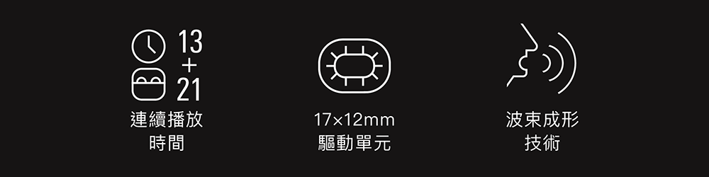 採用能在機身有限的音響空間內最大限度發揮作用的17×12mm橢圓形大口徑驅動單元、並於單體背面設置能控制空氣流向的音響腔體及音響導管。達成理想的驅動單元運動,重現豐富的音效。