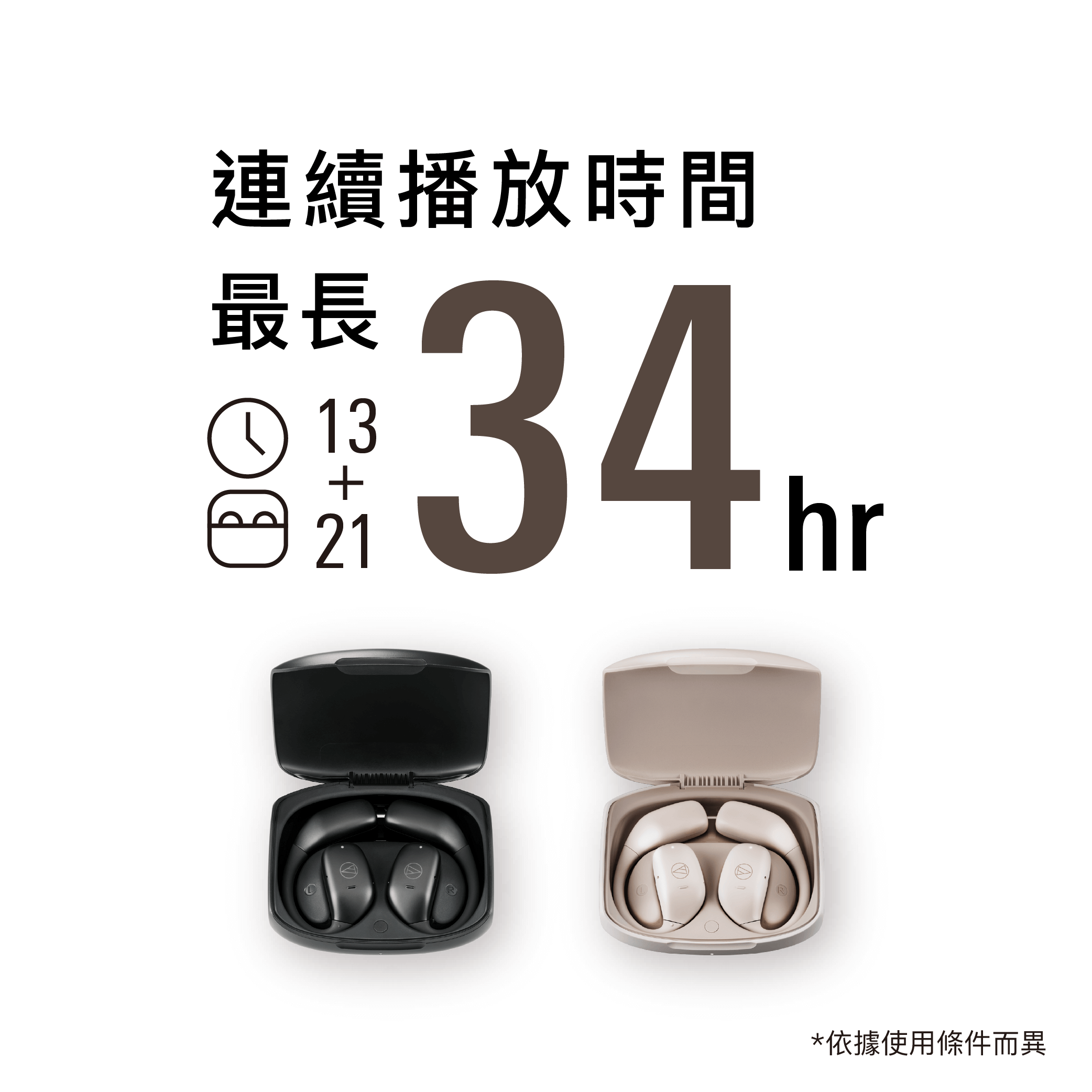 ATH-AC5TW除了能具有能聽見周遭聲音的安心感外,也十分注重使用者對音質的期待。針對開放式耳機容易缺乏低音的結構特性,採用了17×12mm的大型驅動單元。透過兩種強化低音的演算法,享受到平衡且具量感的音色表現。此外,耳機本體可持續使用13小時,搭配充電盒時,續航力更可延長至最長34小時。除了簡單直覺的操作方式之外,輕盈的耳掛式設計,即使長時間佩戴也依舊舒適。