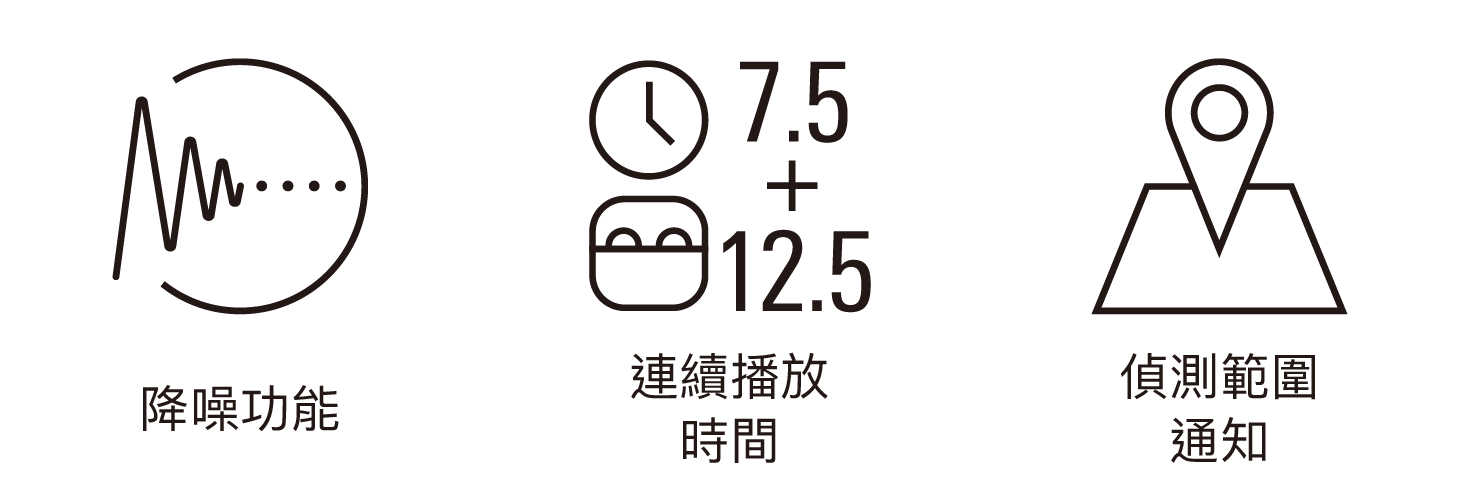 - 電池續航力:連續播放:最長約6.5小時;搭配充電盒最長約17.5小時(降噪開啟時,依據使用條件而異)