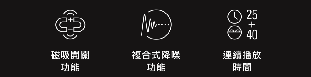 連續播放:最長約25小時(降噪off)/約15小時(降噪on); 搭配充電盒使用最長約65小時(降噪off)/約40小時(降噪on)
