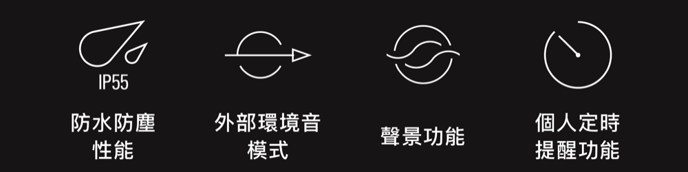 *JIS/IEC防護等級IP5X等級為並不完全防禦灰塵進入,但必須達至一定數量才能對設備的正常運作造成影響,並且完全防止接觸。IPX5代表耳機受到保護,不會因為被噴水而受到影響。請勿於浴室等高溫潮濕的場所使用耳機。耳機主體雖有IP55同等的防水防塵處理,但出音孔部分為非防水/防塵設計。