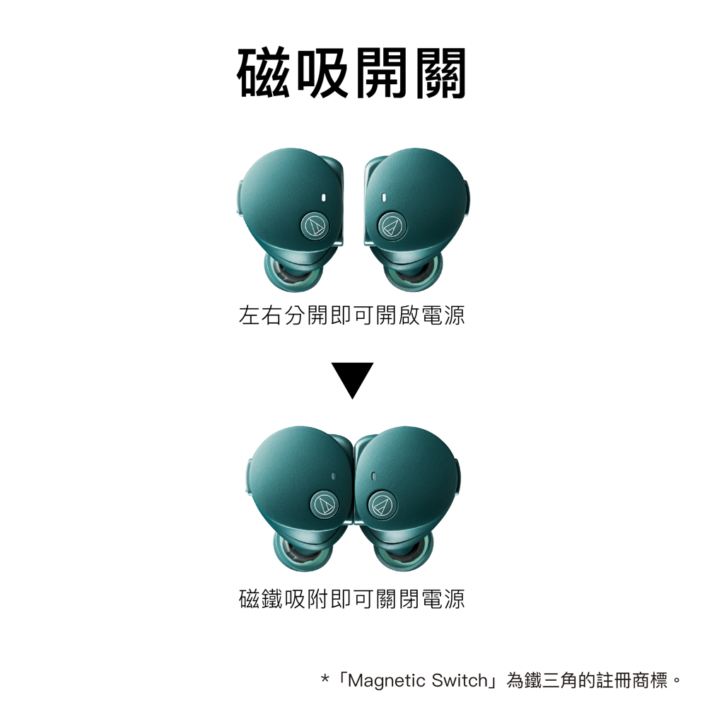 讓喜歡的音樂更加動感的重低音。那,耳機能用什麼方式以最短、最快的方式享受這些體驗?思考得出的想法便是「脫離充電盒的拘束」。只需攜帶耳機即可隨時隨地享受喜愛的音樂和深沉重低音的全新風格。為實現這樣的聆聽風格,鐵三角開發了全新的獨特功能「Magnetic Switch™️ (PAT.P)*」。取出耳機後將兩側分離即可開啟電源,將磁吸開關合併則能關閉電源,是一款前所未聞的劃時代設計。