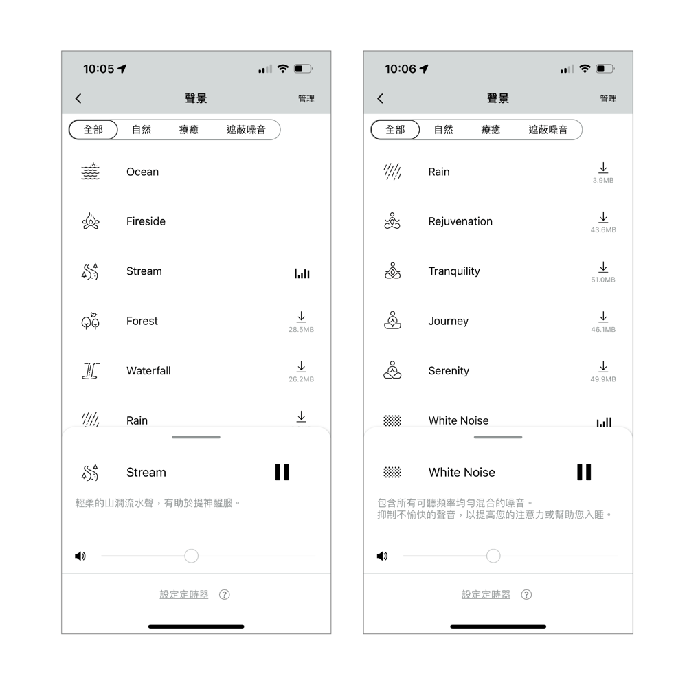 使用專用App可播放使用鐵三角麥克風錄製的各種聲音,除了能促進小憩和平復心情時放鬆效果的自然音聲外,也有提升注意力的定頻噪音及適合提神和冥想的療癒音聲。提供如同身處森林中工作或躺在海灘上休憩般的感受,協助恢復更好的狀態。