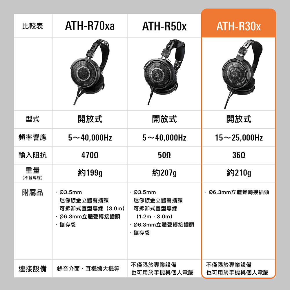 『ATH-R30x』提供扎實的低頻、清晰的中頻及流暢開闊的高頻,能監聽到聲音的表現細節。驅動單元的性能會大幅影響開放式耳機的聲音表現,振膜的運動會直接轉換成聲音,使其能夠提供失真度極低的純淨開放音色。