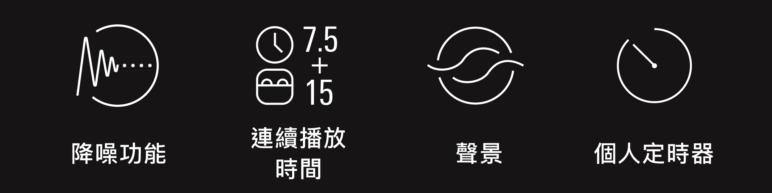 電池續航力:音樂播放,降噪開啟時:耳機最大約 6.0 小時,搭配充電盒使用時最大約 18 小時;音樂播放,降噪關閉時:耳機最大約 7.5 小時,搭配充電盒使用時最大約 22.5 小時(依據使用條件而異)