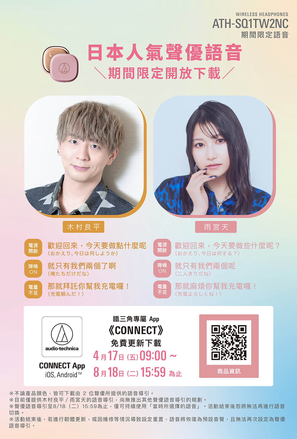 於 4 月 17 日(五)9:00 起至 8 月 18 日(二)15:59 為止,ATH-SQ1TW2NC 可透過更新鐵三角專屬 App《CONNECT》, 下載期間限定專屬語音。