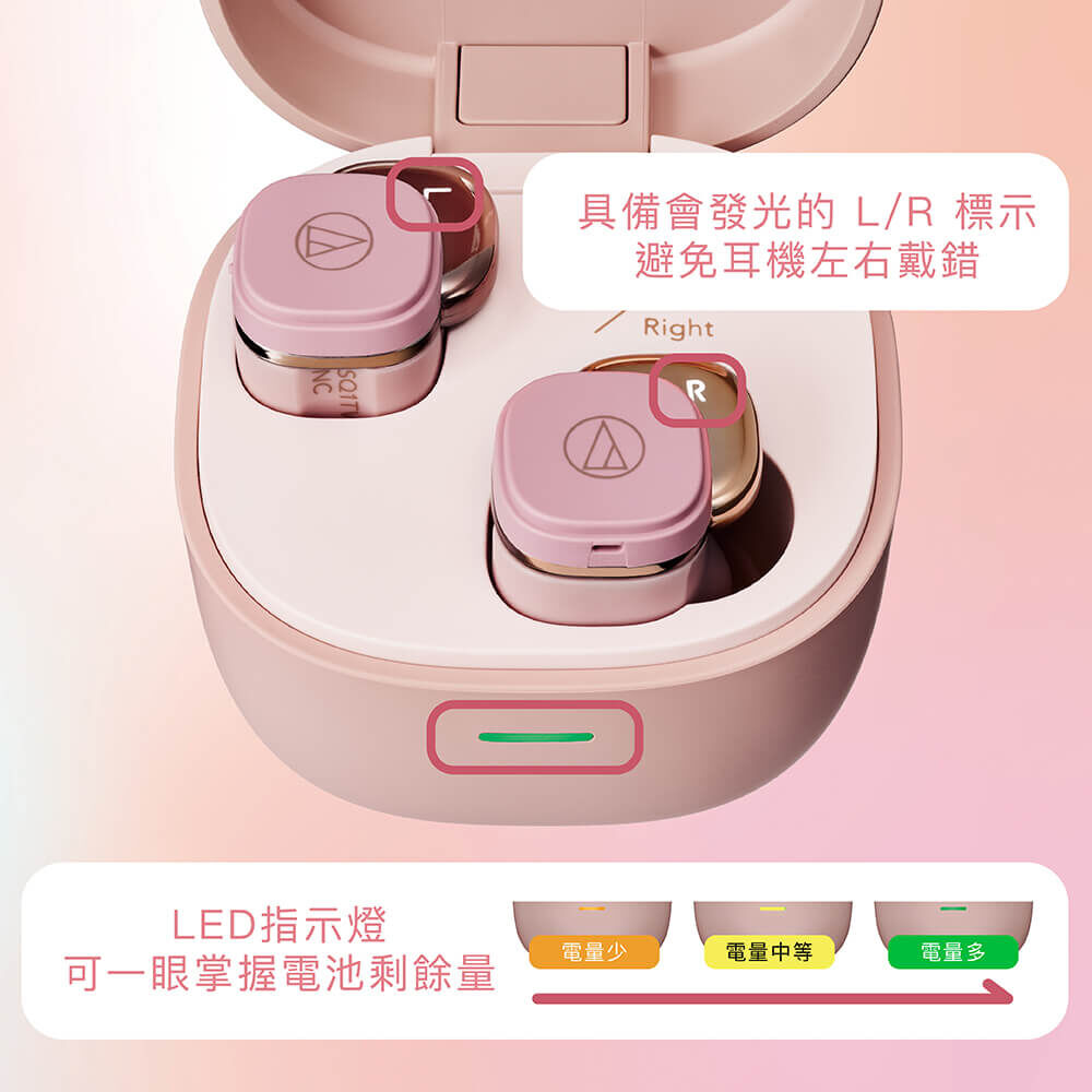 耳機L/R標示發光,即使在光線不足的地方或環境下,也能輕鬆辨別左右,安心佩戴。