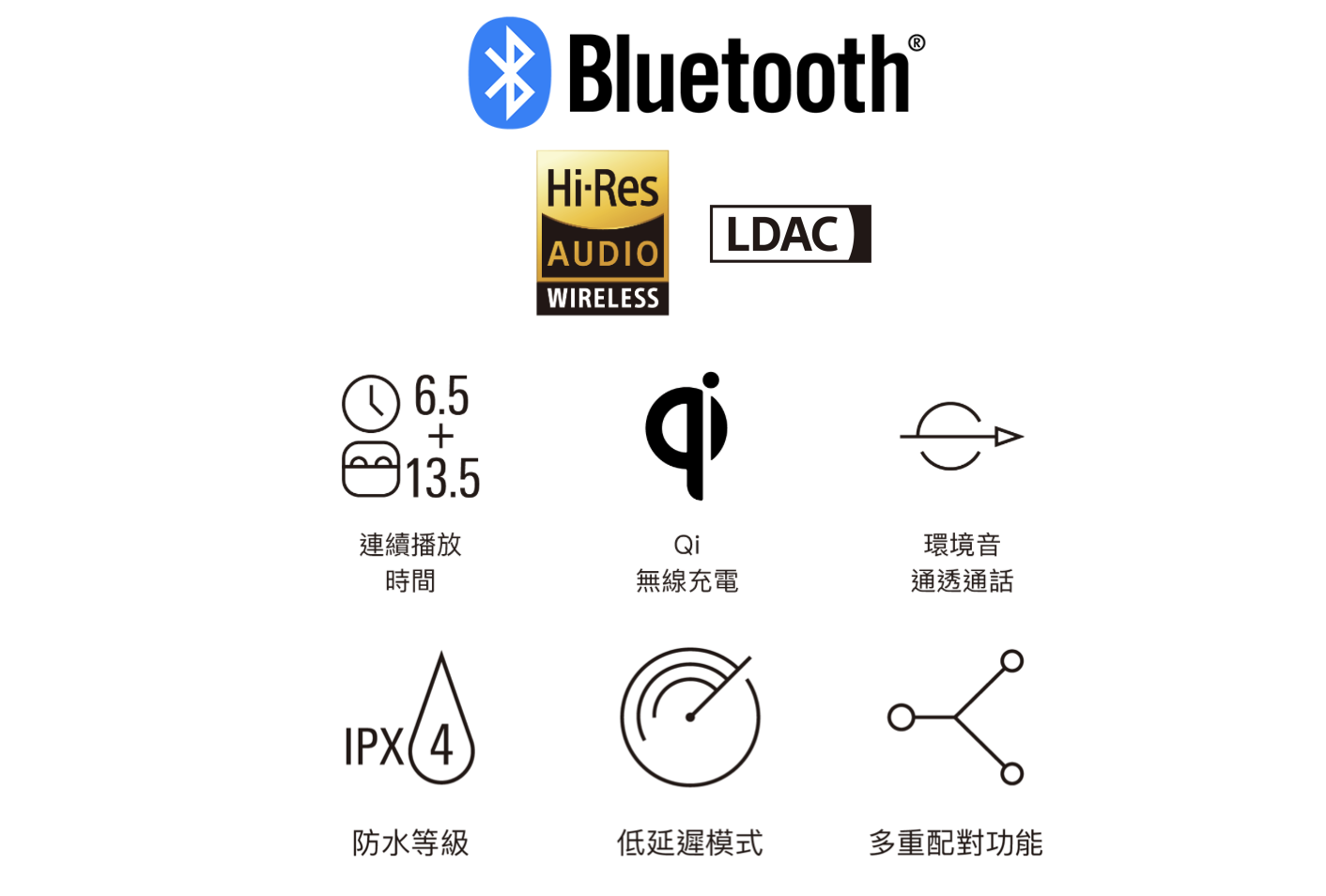 傳輸頻率範圍:10Hz~47,000Hz(使用LDAC 96kHz取樣時)、20Hz~20,000Hz