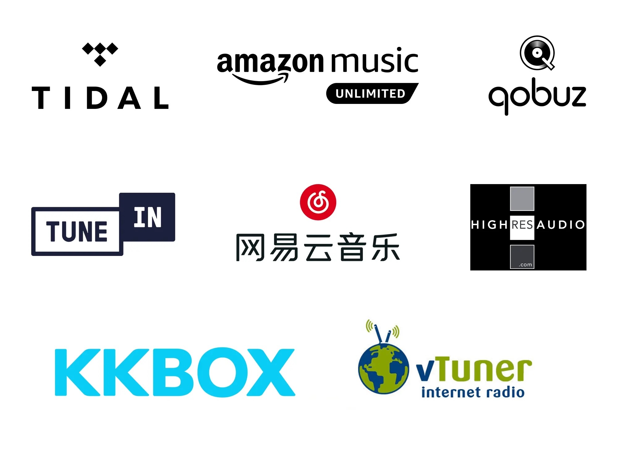 串流輸入:Network shared folder, USB Storage, USB CD Drive, UPnP/DLNA Media Server, Amazon Music Unlimited, HighResAudio, KKBOX, Qobuz Sublime+, Netease Music, TIDAL/TIDAL Connect, AirPlay, Spotify Connect, TuneIn, Internet Radio, Roon Ready