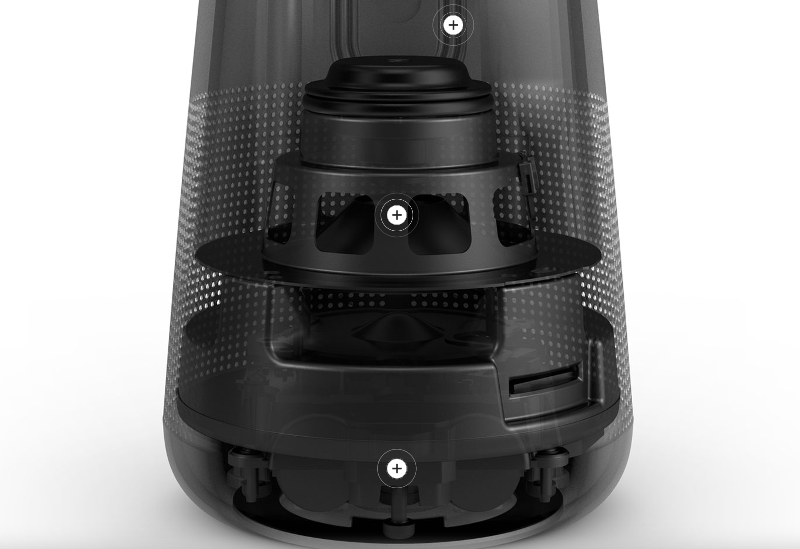別被它的體積給騙了。小巧機身裡蘊藏著從外觀無法想像,更多的科技結晶。高效能揚聲器單體、被動式雙膜共振單體、全方向音頻變流器,這些都是為了帶給您真實的聲音…還有直擊靈魂的震撼體驗。