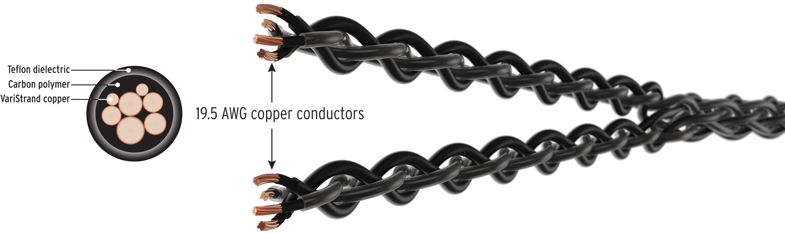 ✅ 由八股導入碳纖的聚合物以及鐵氟龍介質絕緣的19.5AWG導體組成。