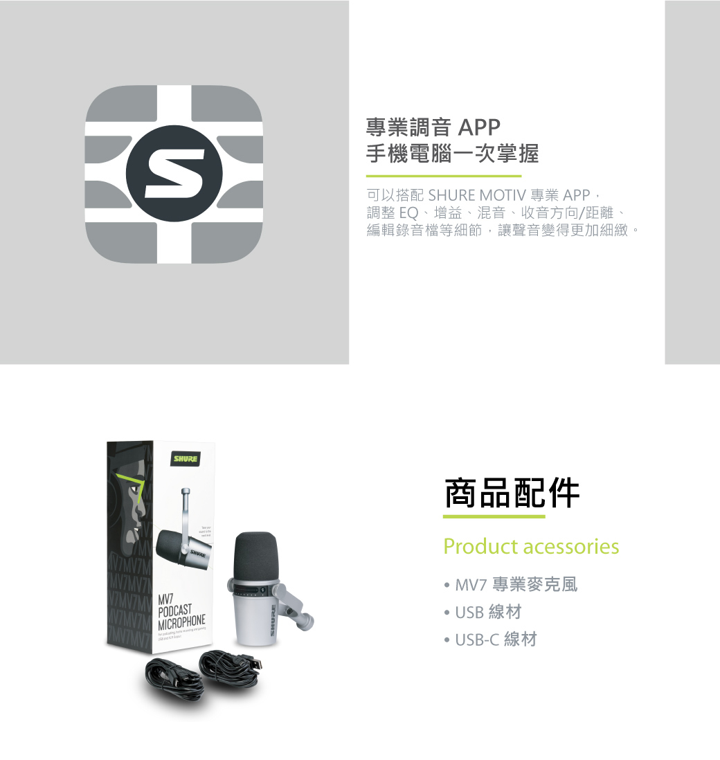 通過USB連接,並在ShurePlus™MOTIV 應用程式探索其他設置功能和自動模式。