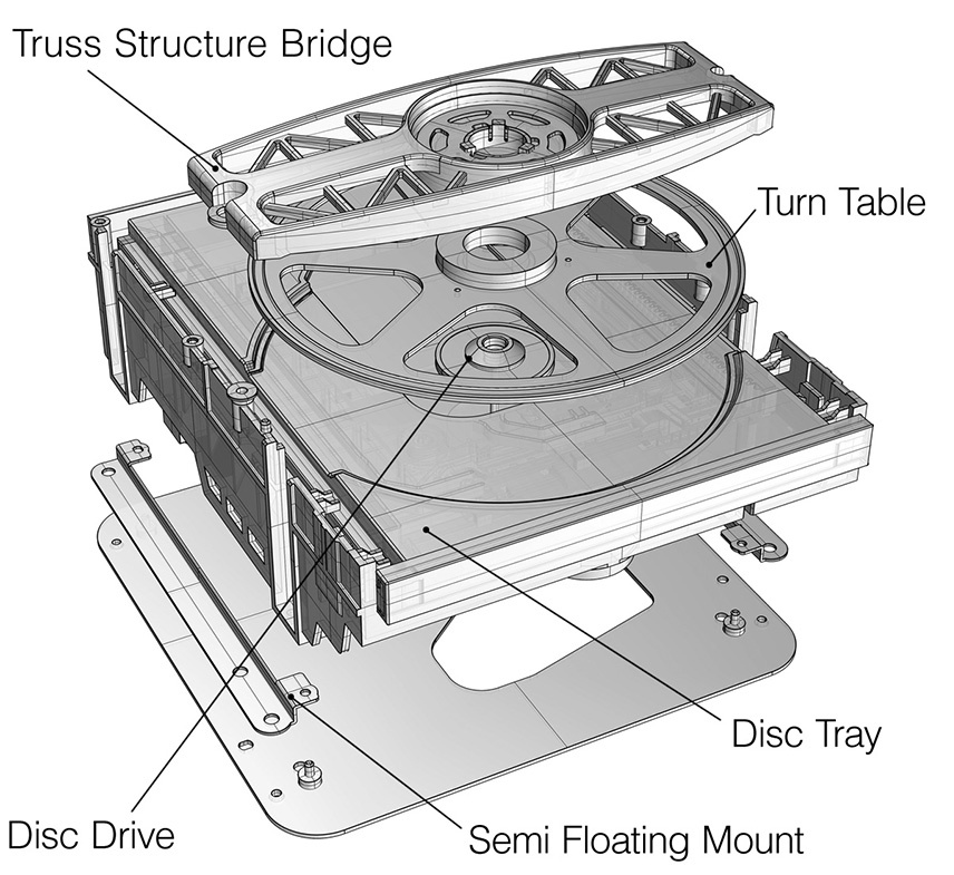 整個轉盤機械部份,以半懸浮狀態的方式安裝在副底盤上,通過壓制轉盤和底盤之間的振動傳遞,減少了共振的影響,覆蓋整個頻率範圍,以此設計得到非常自然的聲音重播效果,另外通過將電機振動與主機架隔離,可有效防止機箱內的共振,同時,使到轉盤與外部振動隔絕,將外部振動完全隔離,大大提高了唱片的讀取精度。