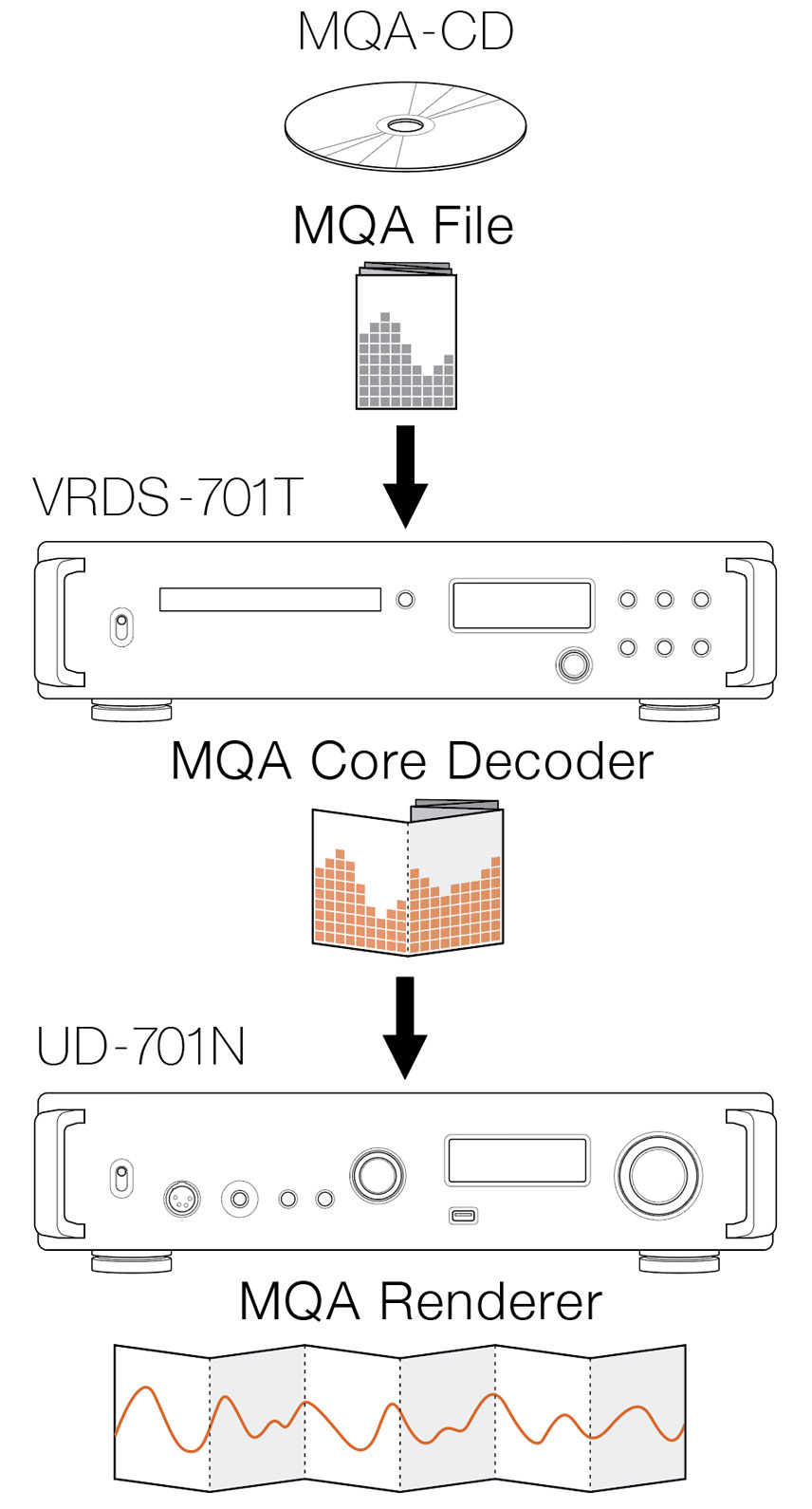 VRDS-701T 內置 MQA 核心解碼器,可以透過數位輸出支援編碼 88.2 kHz 的 MQA CD,此外,結合具有MQA 編碼功能的 DAC 一起使用時,可以使用 MQA 全解碼播放。