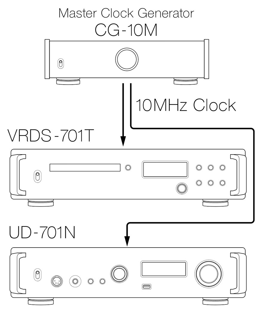 10MHz 時脈輸入允許與外部時鐘同步,除了在使用 VRDS-701 T播放期間提高音質外,這還可以使整個系統與時脈進行同步。